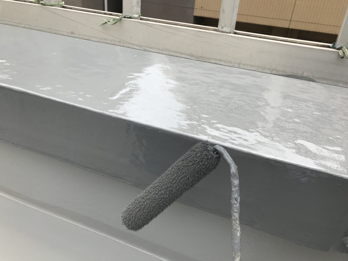 笠木部分にはフッ素系トップコートが塗布されました。フッ素塗料は耐候性に非常に優れており、紫外線による劣化を防ぎつつ、防水層を長期間保護します。
