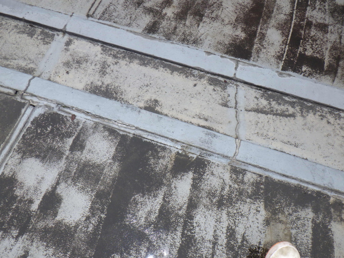 以前防水工事を行ったそうなのですが、すでに防水の効果が切れて塗膜がはがれ、ローラーの軌跡がはっきりわかるほど劣化しています。