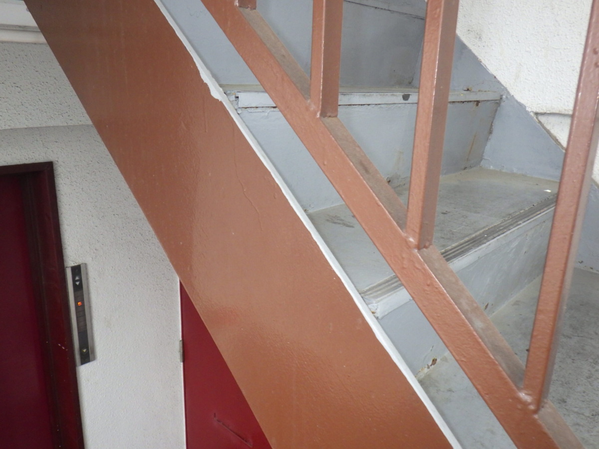 内階段の鉄柵、内階段の窓枠に埋め込まれたH鋼、共用部と屋上を繋ぐドア面、さらに塔屋に登るためのタラップなどの鉄部も塗装します。