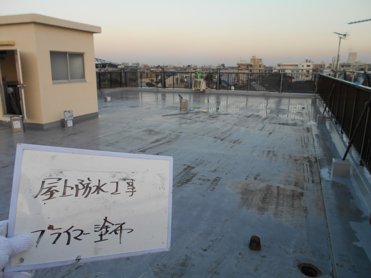 これはメーカーが違ってもほぼ同じ役割で、“古い防水層と新しい防水層をしっかり密着させるためのもの”です。もしこれを塗らずに作業すると、どんなに上手く塗っても剥がれや浮きが起きます。