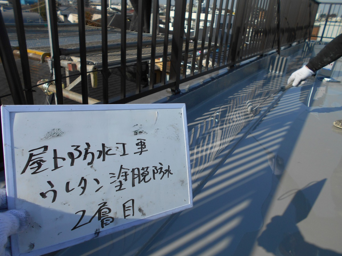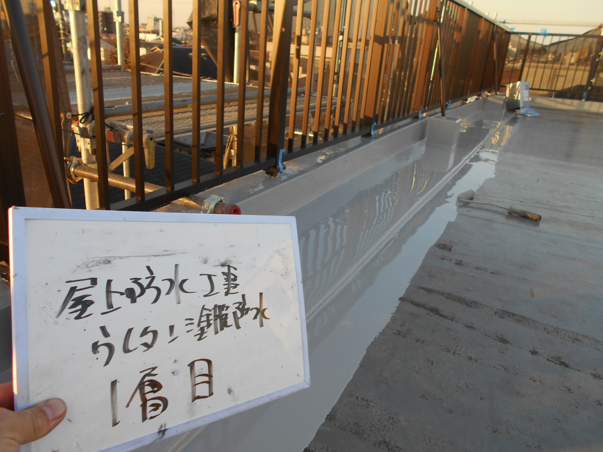ウレタン防水では1層目・2層目を重ねて規定膜厚を作りますが、現場ではただ“規定量を撒けばいい”という単純な話ではありません。