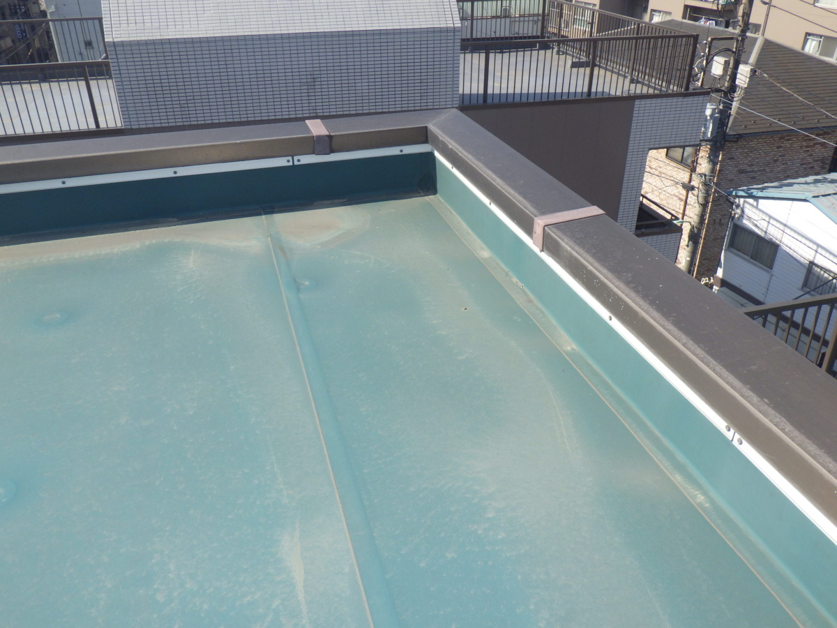 現地を確認すると、防水層の劣化だけでなく、屋上笠木に劣化がありが雨水が回りこむ可能性がありました。防水層は面で成立していても、こうした線状・点状の弱点が残っていると、雨漏りは発生します。