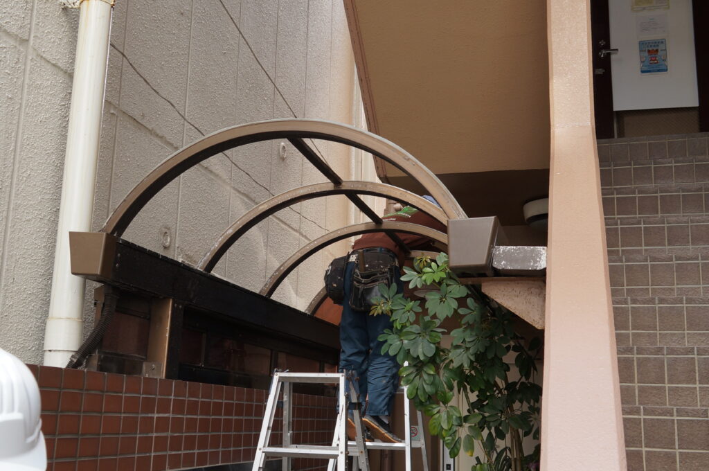 こちらは足場工事前ですが、エントランス入り口屋根のアクリル板があったので、建地を通すために外しています。