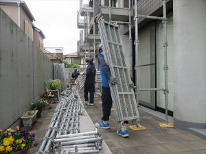 世田谷区で本日から鉄筋コンクリート改修工事の足場組立開始です。