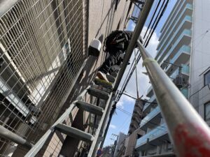 ビルとは言えども住宅街のためお隣は戸建です。今は建物が密集しているため足場組立も相当な配慮が必要になります。
