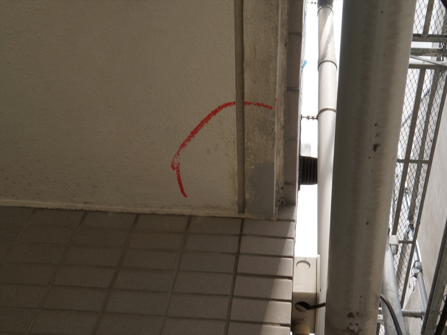 問題のある箇所があった場合はチョークでマーキングをします。さらにマスキングテープを使って状態と範囲を色分けして、ペンで状態を記入します。打診検査は外壁補修前の大事な作業のひとつです。