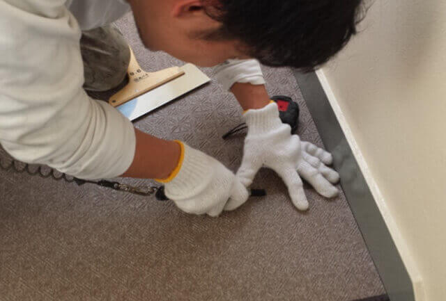 長尺シートは通路や階段なので、入居者の方の出入りに気を配った作業が必要になります。材料カットの段取りを済ませたら手際よく貼り付けをします。