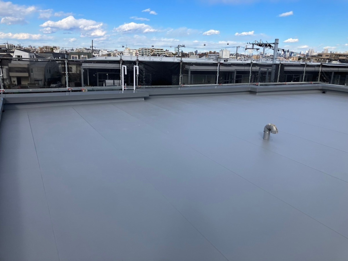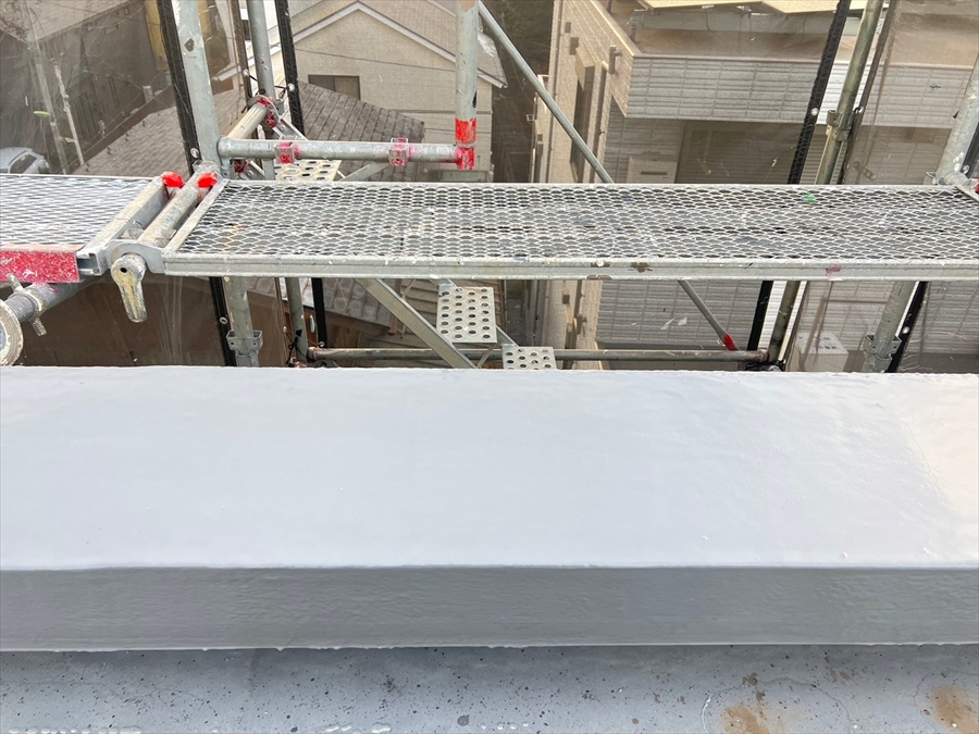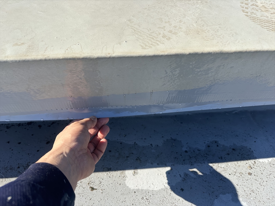 屋上の外周部(笠木)は塩ビシートではなく、柔軟性の高いウレタン塗膜防水を採用。異素材との取り合いを考慮し、プライマー処理や段差調整を丁寧に行いました。