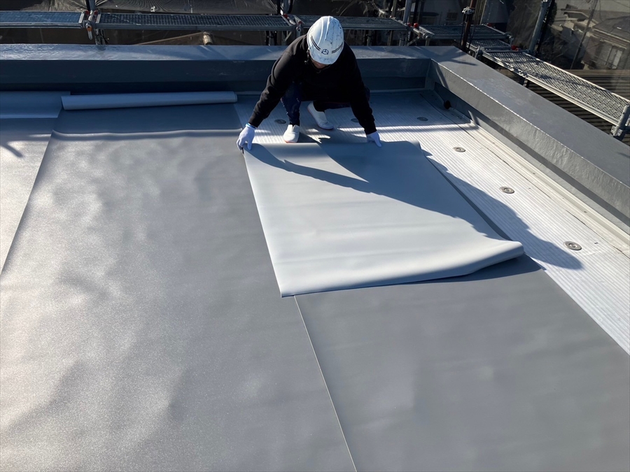 塩ビシートを敷設し、5cmの重ね幅を確保しながら仮固定しました。重ね部分が均一でないと溶着が不十分になるため、位置を微調整しながら慎重に配置。敷設後は全体の張り具合を確認し、たるみや歪みを残さないよう仕上げました
