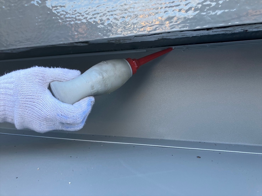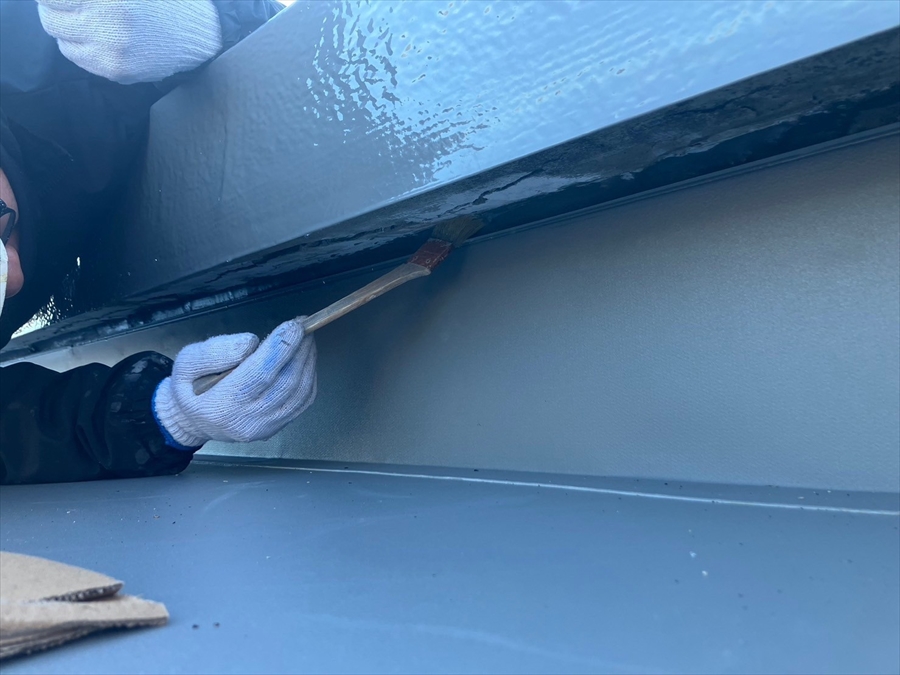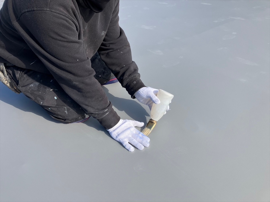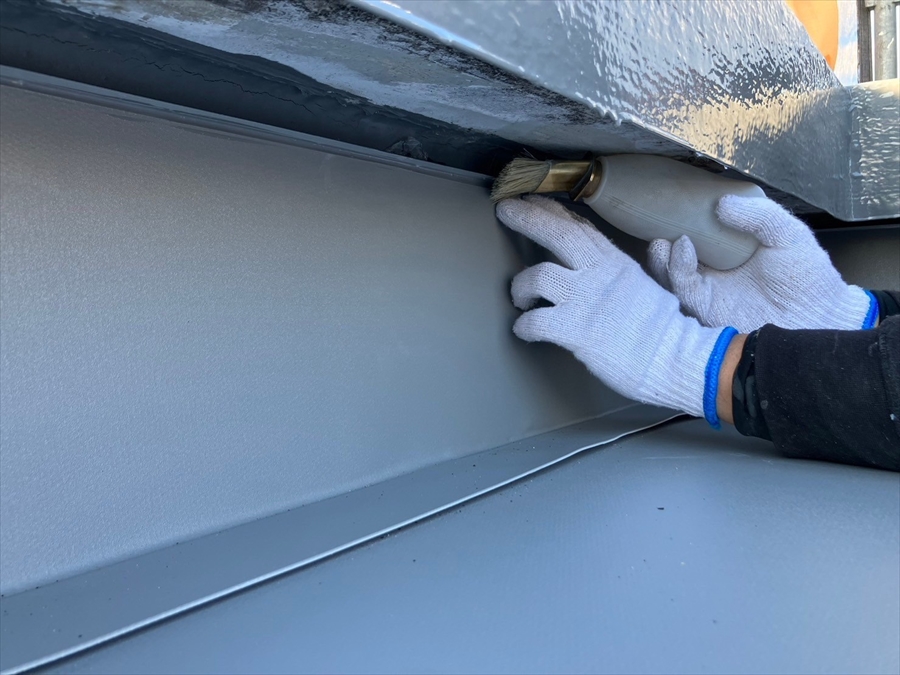 端部は雨水侵入の危険があるため、塩ビ専用シーリング材のエクシールで処理。プライマー塗布後、ヘラで均一にならし、柔軟で強固な防水層を形成しました。