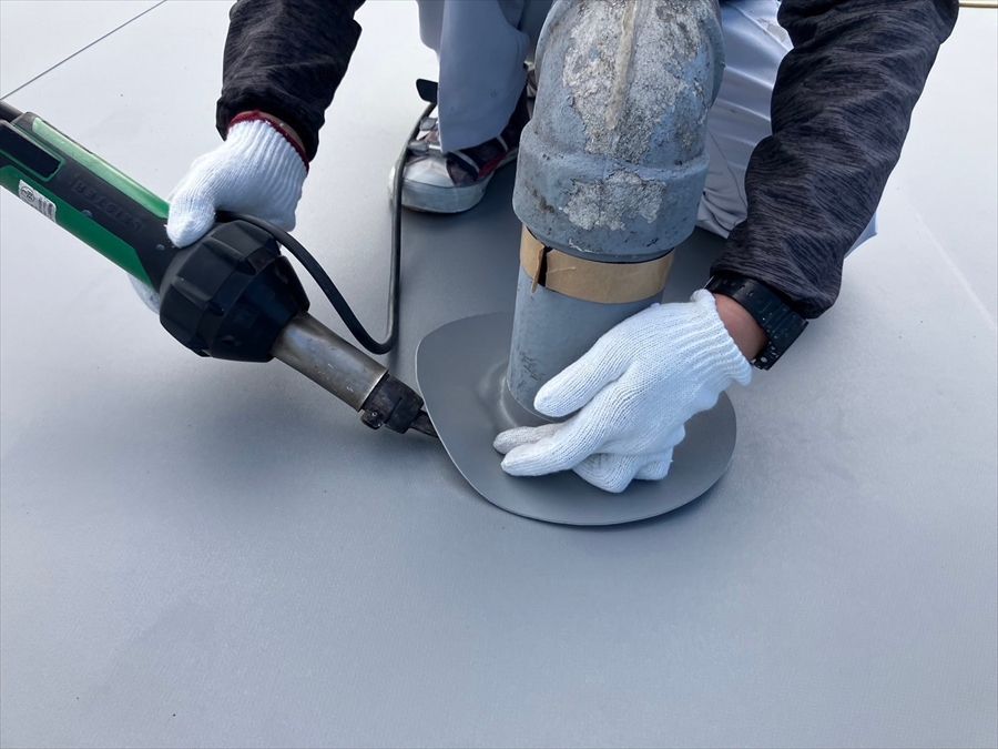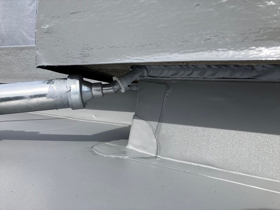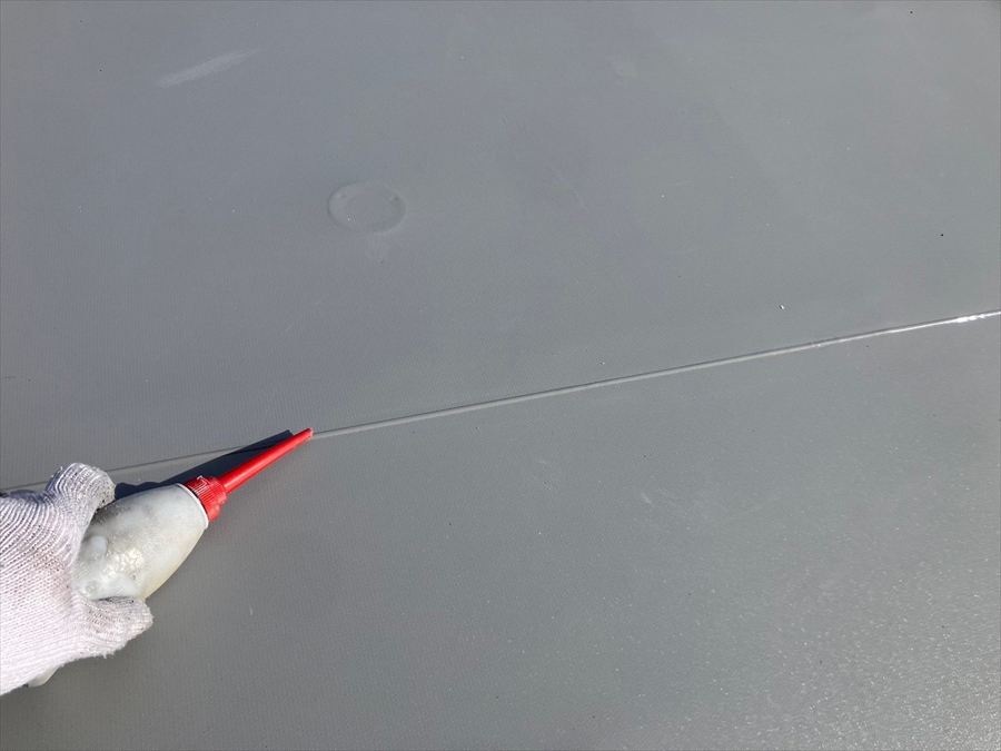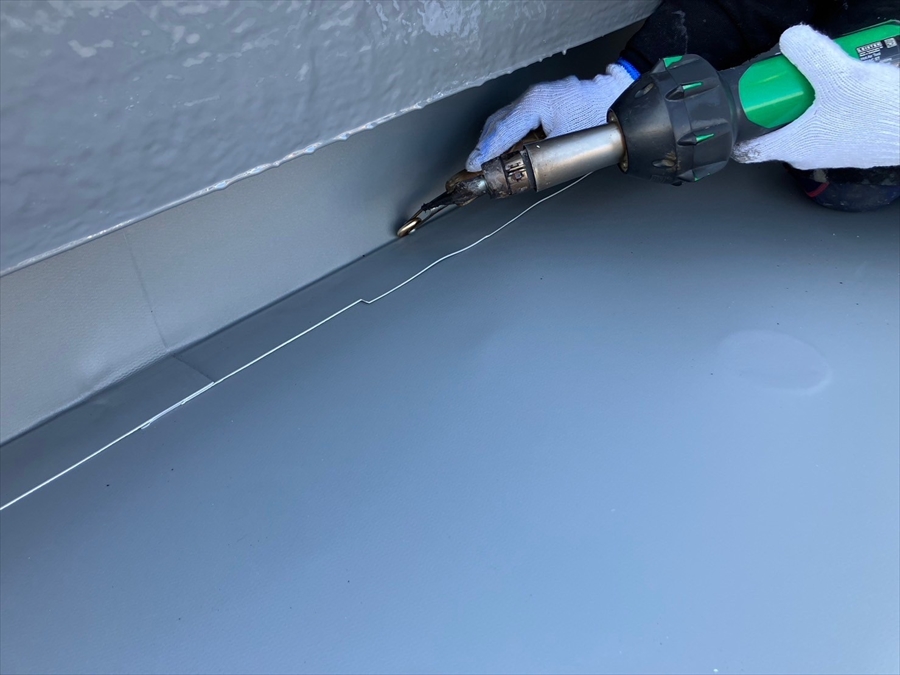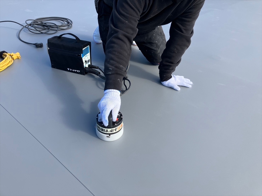 溶着後のジョイント部をすべて点検。浮きや隙間をチェックし、必要箇所に再溶着を実施。細部まで確認することで長期的な防水性能を保証します。
