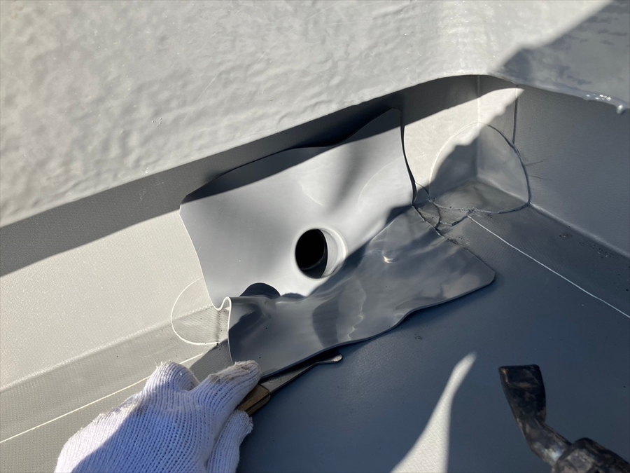 雨水が集中するドレンまわりは特に慎重に施工。清掃後に専用ドレンシートを溶着し、周囲をエクシールで密閉。排水機能を確保しつつ防水性能を高めました。