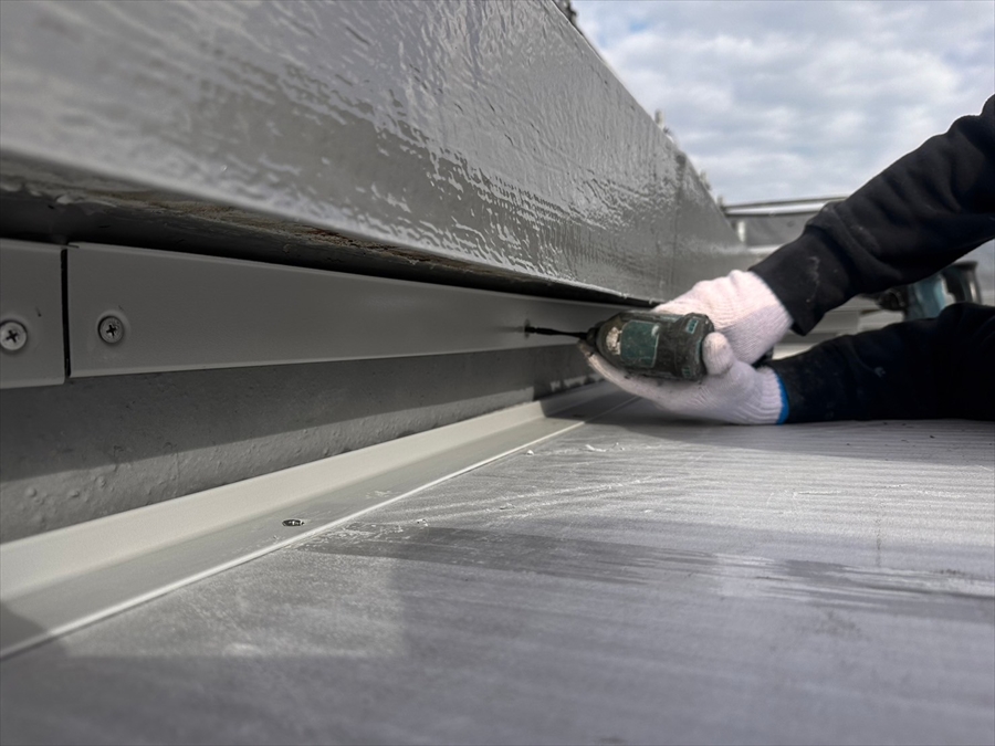 塩ビシートを機械的に押さえるため、屋上端部にL型鋼板を設置。これにより、強風時でも剥離しにくい構造となります。端部の形状に合わせて加工を行いました。