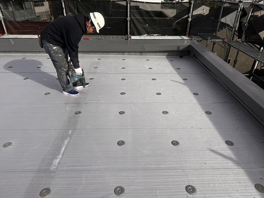 絶縁シートを全面に敷設し、30cm間隔でディスクプレートを固定。端部にはL型鋼板を併用し、安定した支持構造を確保しました。下地を選ばない機械固定工法の強みが活かされています。