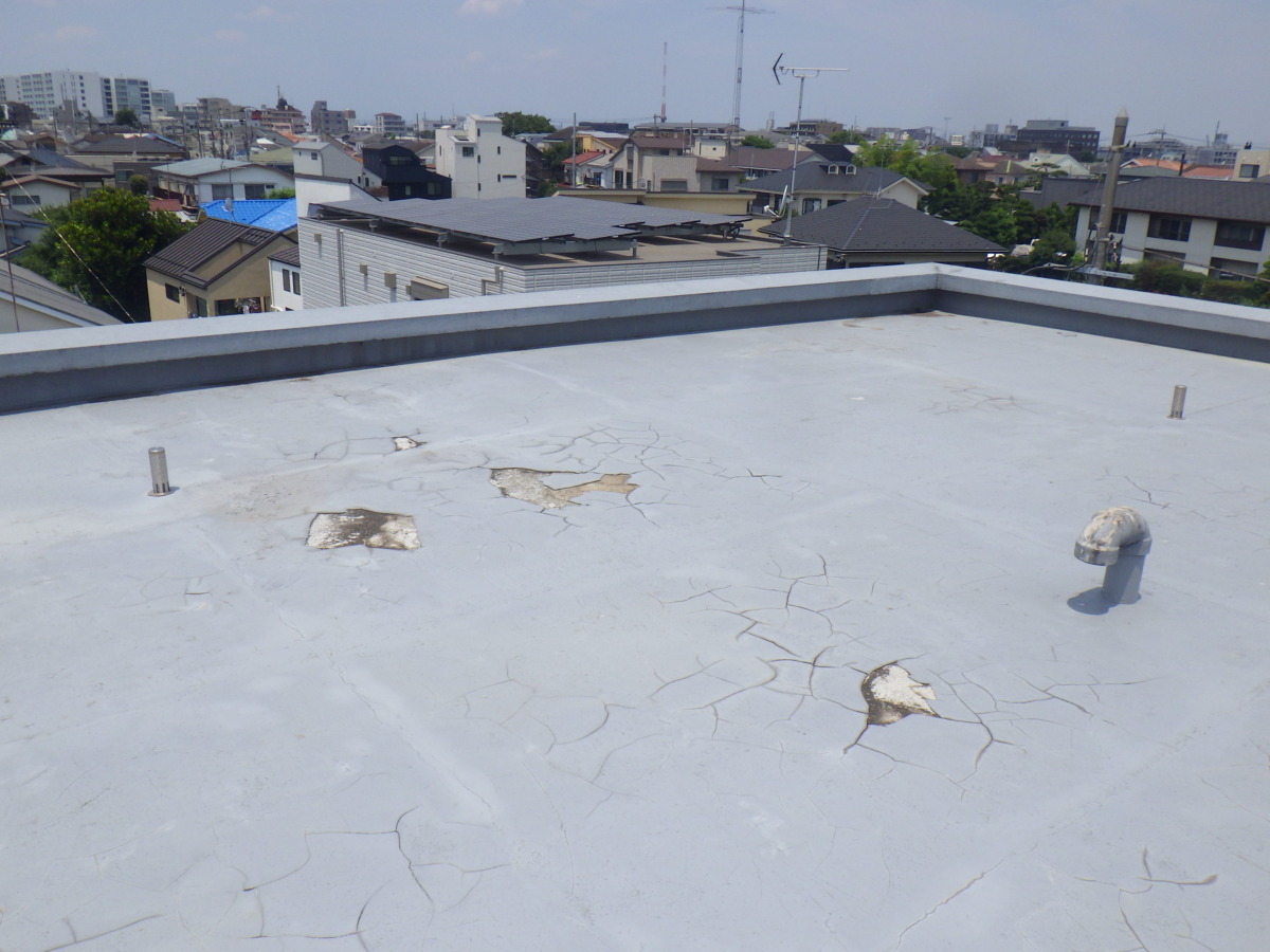 調査の結果、既存防水層は劣化が進み、ひび割れが多発していました。下地補修では十分な効果が得られないため、絶縁シートを用いることで下地を選ばない安全な施工方法を採用しました。