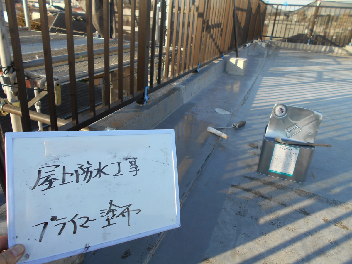 清掃後は、下地と防水材の密着を高めるためのプライマーを塗布します。