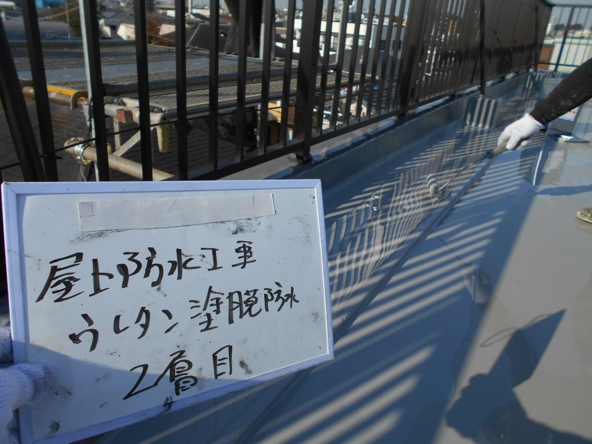 今回の工事では、ウレタン塗膜防水密着工法によって老朽化した屋上を再生しました。